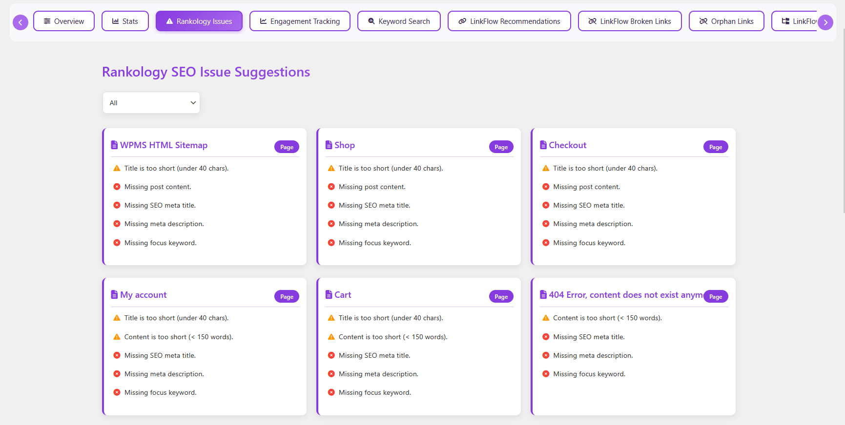 • Rankology SEO Issue Suggestions – Displays SEO issue suggestions with errors and warnings for each post or page (e.g., short titles, missing meta description, missing focus keyword) linked directly to the edit page.