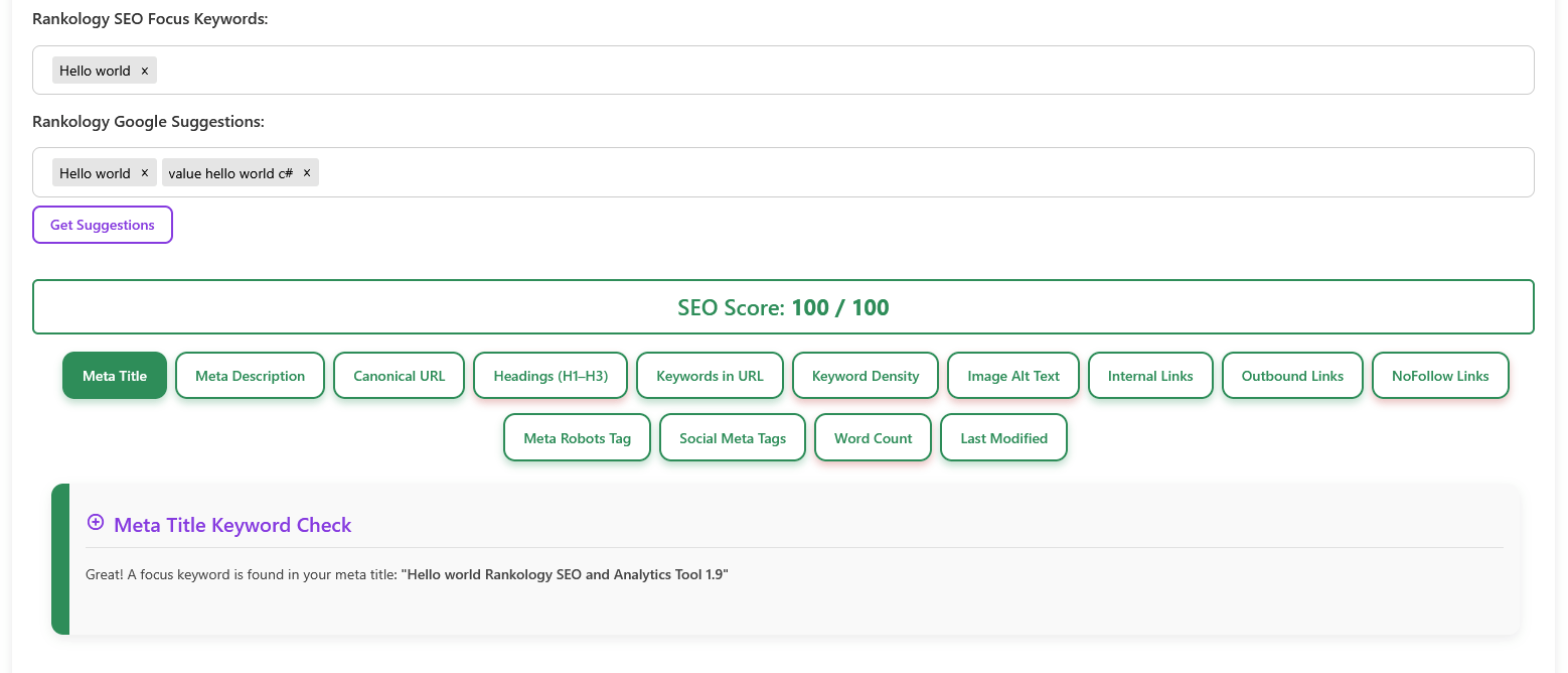 Assign and manage focus keywords for each post/page. Analyze keyword usage in content, headings, URLs, and meta fields to ensure strong optimization signals.