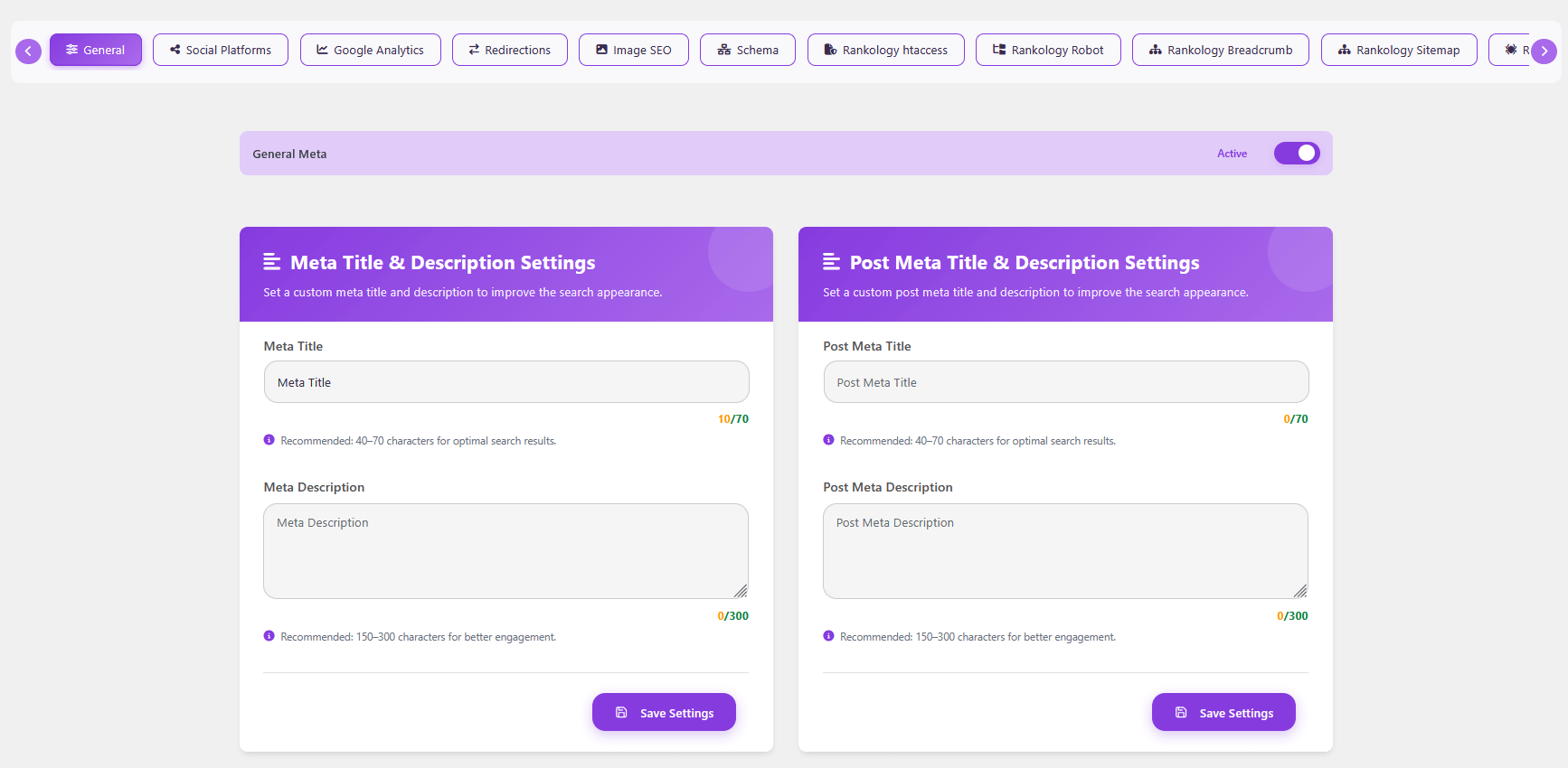 • Configure global meta title & description with separate fields for posts, pages, products, categories, and terms.