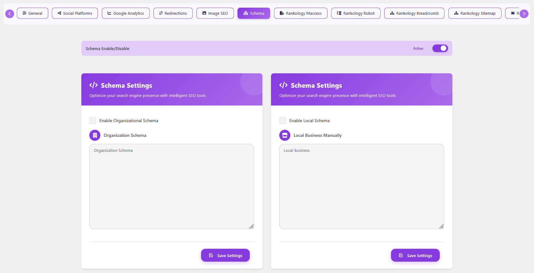 • Enable Organization Schema with dynamic fields (name, logo, contact, social links, etc.).